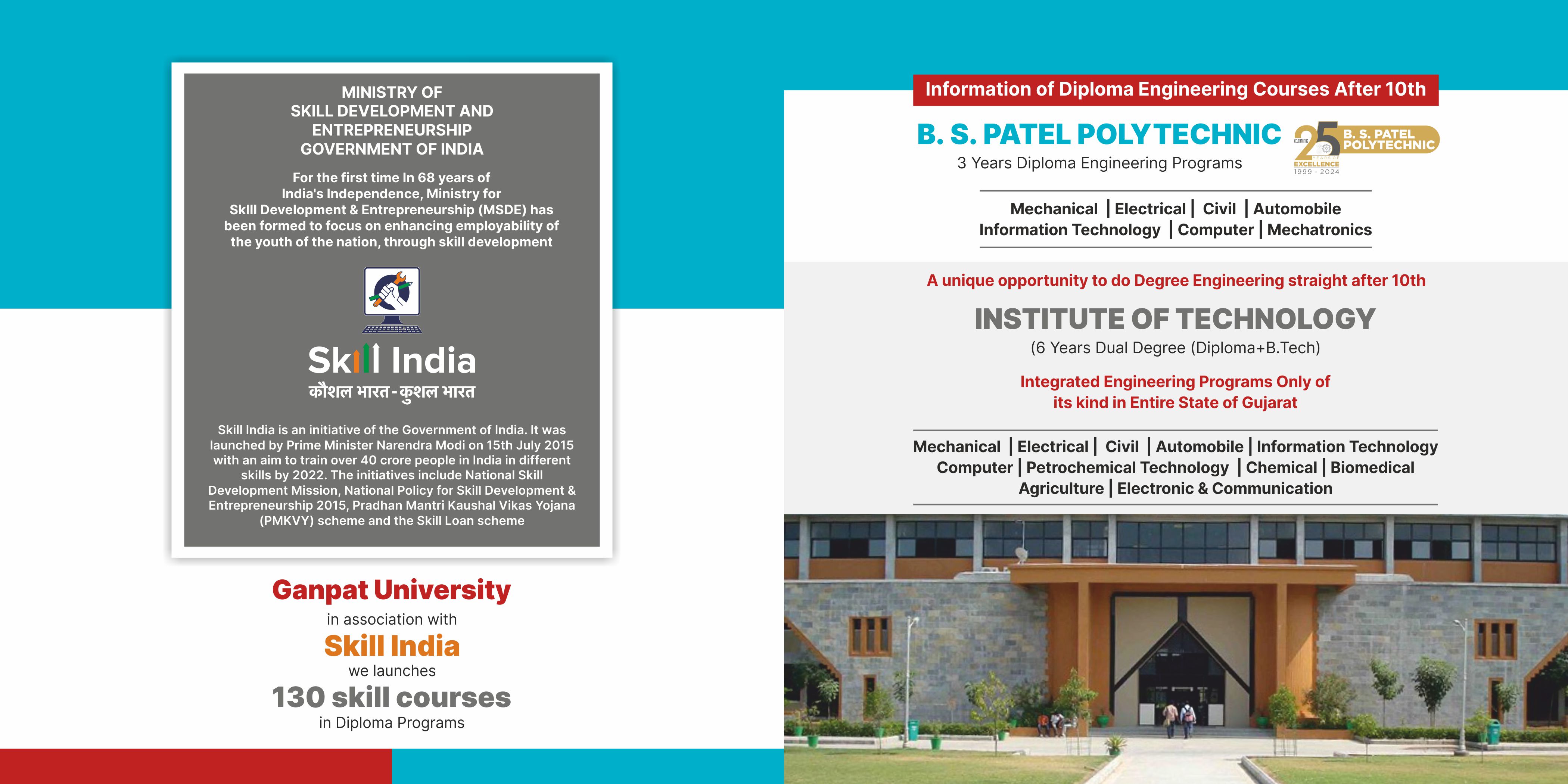 Skill India is an initiative of the Government of India. It was launched by Prime Minister Narendra Modi on 15th July 2015 with an aim to train over 40 crore people in India in different skills by 2022. The initiatives include National Skill Development Mission, National Policy for Skill Development & Entrepreneurship 2015, Pradhan Mantri Kaushal Vikas Yojana (PMKVY) scheme and the Skill Loan scheme. Ganpat University in association with Skill India we launches 130 skill courses in Diploma Programs