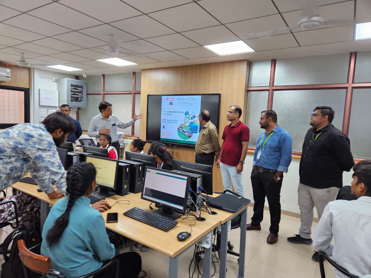 This two-day workshop provided foundational, hands-on training in Introduction of Arduino & Tinkercad which include Interfacing of LED, Push Button and Relay card, Interfacing of Ultrasonic sensor & IR Sensor, Interfacing of Buzzer, Temp & Humidity Sensor, Interfacing of LCD & Servo motor Interfacing of DC motor.