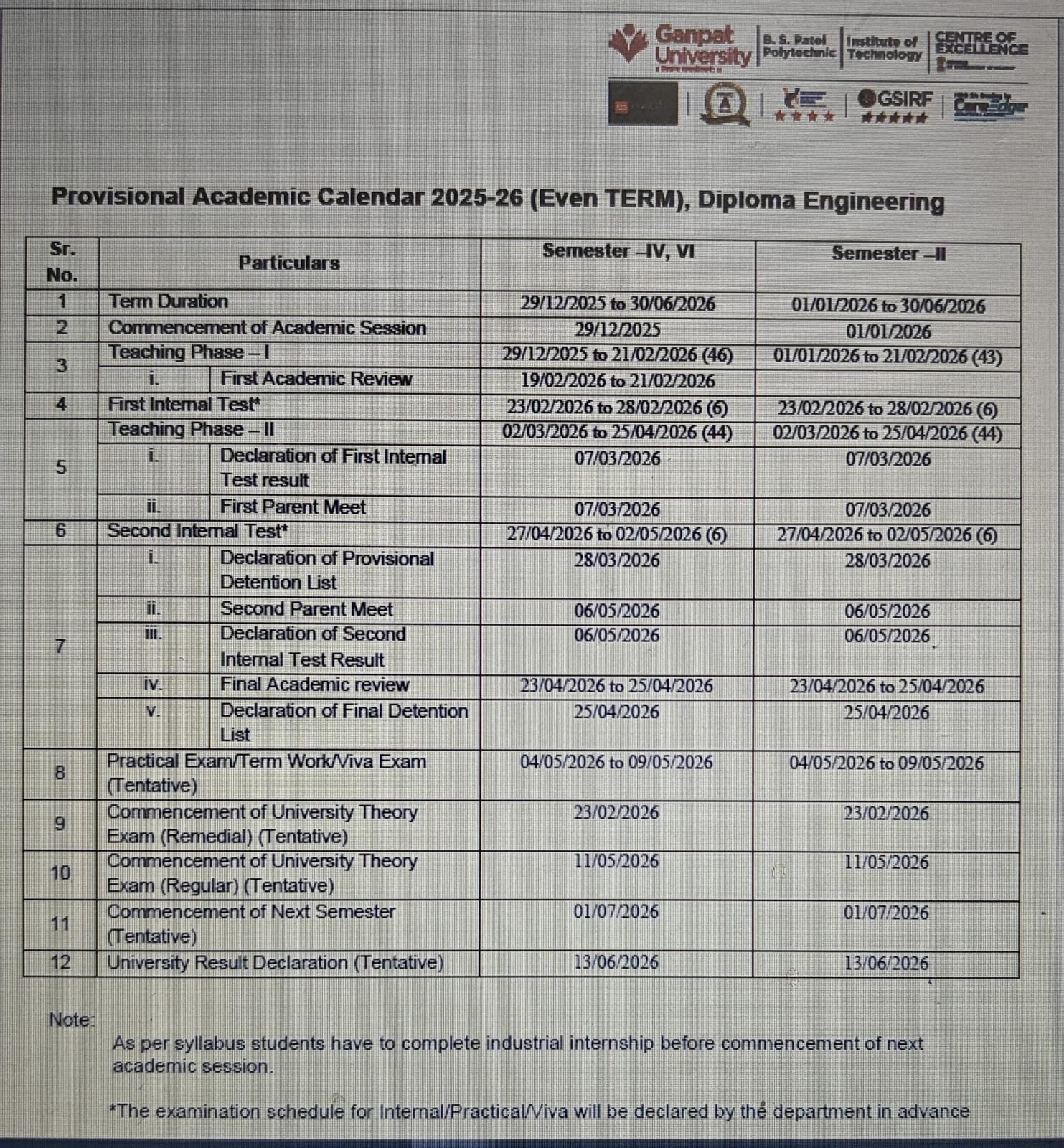 Diploma IOT 2nd Semester Provisional Academic Calendar 2025-26 (EVEN TERM) |